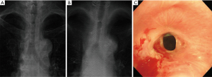 The bronchoscopic intervention was performed according to standard techniques (17,18). Under general anesthesia, the patient was intubated with a rigid bronchoscope tube (Bryan Co., Woburn, MA, USA or Karl-Storz, Tuttlingen, Germany). Then, a flexible bronchoscope (EVIS BF 1T260; Olympus Co., Tokyo, Japan) was passed through the rigid bronchoscope tube, and the central airway was evaluated. The airway stent used in the procedure was a silicone stent (Dumon stent, Novatech, La Ciotat, France) or natural stent (M1S, Seoul, Korea). For some patients, an “angulated stent” was inserted when the straight tube stent did not fit well into the tortuous or distal airway. This stent was created by cutting a straight conventional stent into two separate sections at an oblique angle and reattaching it at the desired angle using non-absorbable sutures (19).