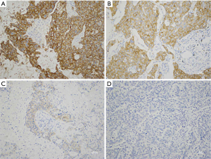 EGFR expression of all 54 specimens was detected by immunohistochemical staining. Based on the score method described earlier, 30 (55.6%) of the 54 tumor specimens had high EGFR expression (Figure 1A,1B), while the other 24 (44.4%) had low EGFR expression (Figure 1C,1D). The χ2-test was then used to detect the correlation between EGFR expression and EGFR G873R mutation. EGFR expression did not show statistical significance with EGFR G873R mutation (P>0.05) (Table 2).