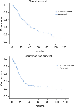 Data were retrospectively collected from the clinical records. Following data were reviewed for the statistical analysis: gender, type of surgery, TNM descriptors, pathological staging, recurrence and survival. Starting from the date of surgery, the long-term outcomes and the prognostic factors were evaluated in terms of OS and RFS. Descriptive statistics were used for exploratory data analysis. The difference in OS and RFS curves were estimated with the Kaplan-Meier method. Median survival times with 95% confidence intervals (CIs) and a log-rank test were conducted to determine the variation in the survival distribution for the different variables. Cox proportional hazard regression models were adopted to establish hazard ratios. Tests of Model Coefficients were run to evaluate the adequacy of variables to explain the events. Both OS and RFS multivariate analysis were performed with adjustment for Type of surgery, R2 surgery, pN. All P values were based on a 2-sided hypothesis, and those <0.05 were considered statistically significant. Statistical analysis was performed with IBM SPSS Statistics, Version 25.0. Armonk, NY: IBM Corp.