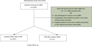 Despite rapid advances in percutaneous coronary intervention (PCI), coronary artery bypass grafting (CABG) remains the gold standard in the treatment of multivessel coronary artery disease (CAD) (1). Unfortunately, variations in the coronary anatomy, extreme calcifications, stenotic lesions or complete coronary occlusions, and the clinical status of the patient may avert complete revascularization (CR) (2). A consequence of incomplete revascularization (IR) is the risk of postoperative myocardial injury (PMI), defined as an isolated elevation in cardiac biomarkers greater than the upper limit of normal, in the 48-h post-operative period (3). PMI is associated with increased hospital morbidity and mortality (4,5) with an estimated incidence of 1–10% (6,7). However, elevation of cardiac biomarkers occurs in virtually all patients undergoing CABG surgery, and there is no clear consensus on the degree of elevation of cardiac biomarkers at which it becomes either clinically relevant or prognostically significant. Therefore, the subtle and difficult presentations of PMI often require rapid and effective diagnostic and therapeutic intervention to prevent the complication of postoperative myocardial infarction (MI) and ensure preserved cardiac function. Should postoperative MI occur, emergent coronary angiography (ECA) has been shown to be an effective tool in eventually restoring hemodynamic instability following CABG (4,8-11). Data on the impact of postoperative MI on long-term outcomes after CABG are, however, surprisingly sparse.