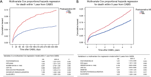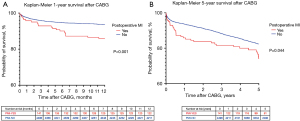 Based on the multivariate cox-regression models, the standardized risk of death within 1 year and 5 years after CABG was higher in patients with PMI (HR 1.942, 95% CI: 1.277–3.073, P=0.005; HR 1.451, 95% CI: 1.010–2.083, P=0.044, respectively) (Figure 3).