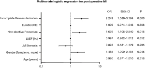 Univariate and multivariate stepwise forward regression models were constructed to determine risk factors for PMI. Parameters which were statistically significant in univariate models and parameters which were determined clinically significant (i.e., EuroSCORE II, age, LVEF) were included in the final model. In case of high interdependence between parameters (i.e., acute coronary syndrome and non-elective surgery), the parameter with higher impact on the outcome was selected for the final model. The ensuing statistical models were used to define the odds ratios (ORs) point estimate and 95% CI. Results of univariate Cox regression analysis for death within 1 year and 5 years of CABG are reported in Tables S1,S2.