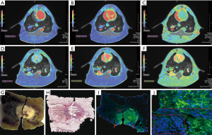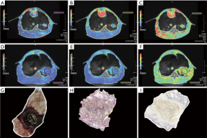 CTP has been widely applied to the assessment of tumor angiogenesis, prediction of cancer pathologic grading and evaluation of tumor response to treatment (10). CTP evaluation of tumors after RFA has been mainly focused on liver cancer, which usually manifests as low and high blood perfusion within completely versus incompletely treated tumors (11-13). Few investigations of CTP on lung cancer after RFA have been carried out, and the majority utilized the single-input (usually systemic circulation) model of CTP without taking into account pulmonary arterial circulation (14). Lung cancers have been verified to have a good deal of pulmonary blood supply besides bronchial blood supply (15,16). Thus, CTP with dual-input model on assessment of lung tumors after RFA might be more reasonable and accurate. Besides, previous investigations on treatment assessment using conventional imaging are usually based on the routine morphological pathology, which might underestimate the effect of RFA (17). The thermally fixed or apoptotic tumor cells sometimes manifest as normal vital cells on H&E staining, yet the enzymes and proteins used to maintain cell activity have been denatured, and cells have been inactivated (17). Nevertheless, these pathological changes could be detected by specific staining, including nicotinamide adenine dinucleotide hydrogen (NADH) and TdT-mediated dUTP nick-end labeling (TUNEL) (18).