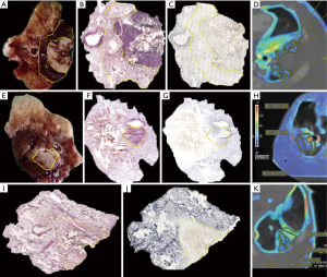 The following steps were used to well register between CTP images and pathological images: firstly, cross-sectional CTP images across the maximal axis of the tumor before RFA were marked by both tumor contour and adjacent anatomic structures (e.g., tracheal carina, ascending aorta, heart atrium and ventricle); secondly, cross-sectional CTP images across the maximal axis of the tumor after RFA were identified by cross checking with the marked CTP images in the prior step; thirdly, large histological section with H&E staining which were well correlated with CTP images were identified by cross-referring to both tumor contour and adjacent lung parenchymal structures (e.g., lobar and segmental bronchus, pulmonary artery and vein). NADH and TUNEL staining histological sections were then made for further subgrouping.