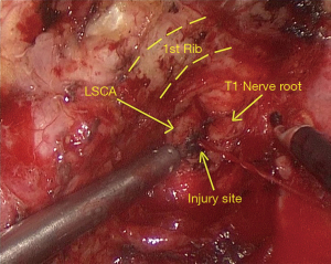 In most cases, bleeding from iatrogenic subclavian artery injuries, especially lacerations located at the thoracic outlet, is catastrophic. Tam et al. reported the first successful thoracoscopic suture of a subclavian artery injury caused by central venous catheterization (5), but did not provide sufficient technical details.