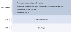 Massive hemorrhages caused by vascular injury are the most dangerous complications during thoracoscopic lung surgery. The first instinct of thoracoscopic surgeons was conversion to thoracotomy when facing major hemorrhage during surgery. Several effective methods to address bleeding, such as the use of thrombostatic material and biological sealants, or the discreet utilization of energy sources, have been summarized (1). We have described a series of strategies for bleeding pulmonary vessels during thoracoscopic lung surgery (2). However, managing severe bleeding from hyperbaric systemic arteries remains challenging even for experienced thoracoscopic surgeons and has been rarely reported. The subclavian artery at the thoracic outlet is in the deepest position of the thoracic cavity and is difficult to repair in this narrow space once injured, even if the surgery is converted to a thoracotomy. This article presents a successful left subclavian artery repair procedure at the thoracic outlet under the thoracoscopic approach with a video demonstration (Video 1) and describes its technical characteristics. Although the present case was planned for a three-portal thoracoscopic surgery, the experience we shared here might as well be referenced during two-portal or uniportal thoracoscopic surgery.