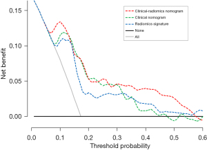 The Harrell concordance index (C-index) was calculated to quantify the discriminative ability of prediction models. To quantify the incremental value of radiomics signature in predictive accuracy, we also calculated the integrated discrimination improvement (IDI) and net reclassification index (NRI). The two assessment indexes, as an effective supplement to area under the receiver operating characteristic curve/C-index, were used to estimate performance improvement for models when introducing a new variable (23). The calibration curves for nomograms were depicted to assess the agreement between predicted probabilities with nomograms and actual observed probabilities. The decision curve analysis was conducted to exhibit the clinical utility of prediction models by assessing the overall benefits across a range of reasonable diagnostic thresholds in comprehensive consideration of insufficient treatment (false negative) and excessive treatment (false positive) (24).