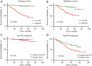 To estimate survival benefit of ACT, risk score (RS) for clinical-radiomics nomogram was calculated with a linear polynomial of corresponding risk predictors weighted by respective Cox regression coefficients. Patients were categorized into high RS and low RS subgroup by the optimal threshold determined by the X-tile. Then DFS of all patients between patients receiving surgery with ACT and without ACT in low RS or high RS subgroup was analyzed using Kaplan-Meier curves and Cox proportional hazards regression analysis.