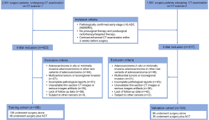 The study was conducted in accordance with the Declaration of Helsinki (as revised in 2013). The Institutional Ethics Committee of Tongji Hospital approved this retrospective study (No. TJ-IRB-20180615) and the requirement for informed consent was waived. We retrospectively reviewed 4,124 patients receiving tumor radical resection and systematic lymph nodes dissection in Tongji hospital affiliated to Huazhong University of Science and Technology from May 2012 to September 2016. Totally, 186 eligible patients from 2,561 patients undergoing preoperative contrast-enhanced CT examination on the multi-slice spiral CT scanner of GE Discovery CT 750 HD (CT scanner 1) were included and constituted the training cohort. We enrolled 124 eligible patients from 1,563 patients receiving preoperative contrast-enhanced CT examination on the multi-slice spiral CT scanner of TOSHIBA Aquilion One (CT scanner 2) to set up the validation cohort. The inclusion criteria consisted of: (I) pathologically confirmed early-stage (I–II) ADC with negative margin and without regional lymph node and distant metastasis (N0M0R0); (II) no presurgical radiotherapy/chemotherapy and postsurgical radiotherapy/targeted therapy; (III) within interval time of 2 weeks between presurgical contrast-enhanced CT examination and surgical resection. Tumor stage was determined according to the eighth edition of TNM classification for lung cancer. We excluded the patients: (I) with ADC in situ, minimally invasive ADC, the rare variants of ADC including mucinous, cribriform, colloidal, fetal and intestinal ADC; (II) with two or more metachronous and synchronous primary tumors or locoregional invasion; (III) incomplete pathological reports; (IV) presurgical thin-section CT images were unavailable or CT images were highly distorted by motion artifacts; (V) lack of follow-up data; (VI) subjected to other cancers.