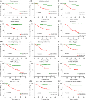 A total of 851 radiomics features were extracted from the delineated three-dimensional volume of interests (Table S1). After excluding the radiomics features with ICC <0.80, 704 features were retained. The redundant features with Spearman correlation coefficient >0.7 were then removed and the remaining 42 features were reserved to be normalized by Z-score and selected by LASSO Cox regression algorithm. Eventually, thirteen nonzero coefficient features were used to construct radiomics signature (Figure 2A,2B) and their regression coefficients were depicted in Figure 2C. The detailed formula for calculating the Rad-score was showed in Appendix 2. The optimal threshold of Rad-score generated by the X-tile was 0.169, which classified patients into high Rad-score and low Rad-score subgroup. Patients with high Rad-score (>0.169) had poorer survival than those with low Rad-score (≤0.169). Kaplan-Meier curves for two subgroups were significantly separate in training cohort (HR: 13.45; 95% CI: 5.25, 34.42; P<0.001) and a significant survival difference was also observed in validation cohort [HR: 6.51; 95% CI: 2.64, 16.08; P<0.001; Figure 3A(A1,A2)]. When all patients were stratified by gender, age level, smoking history, CEA status, Ki-67 LI and tumor size (4 cm), the survival differences between two subgroups were also significant (all P<0.05; Figure 3B-3G). The radiomics signature achieved a C-index of 0.779 (95% CI: 0.719, 0.840) in training cohort and 0.801 (95% CI: 0.713, 0.890) in validation cohort.
