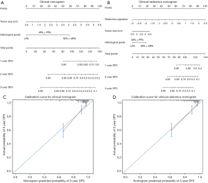 Univariate and multivariate Cox regression analysis were used to identify independent clinical risk predictors associated with DFS. Then the clinical risk predictors were incorporated to construct a clinical nomogram based on multivariate Cox proportional hazards analysis with regression coefficients. Similarly, a clinical-radiomics nomogram was constructed integrating clinical risk predictors along with radiomics signature.