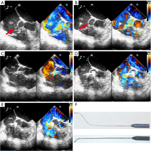 PCC of RSVA was first reported by Cullen et al. in 1994 and has recently been widely used in the treatment of RSVA (5,20-24). However, this technique requires a long delivery pathway and is performed under X-ray, which cannot accurately delineate the anatomical structure of tissues adjacent to the RSVA, and X-rays can be damaging to both patients and doctors. Moreover, PCC is difficult to convert to surgical repair when closure fails and cannot be performed for some patients with a prior history of allergies to contrast media. In contrast, transthoracic closure under TEE guidance can not only clearly define the anatomy of the RSVA and its adjacent structures, but can also shorten the delivery pathway and enable the occluder to be released easily in a more stable position, similar to findings reported by Liang et al. (25). In addition, the procedure can easily be converted to surgical repair if the closure fails.