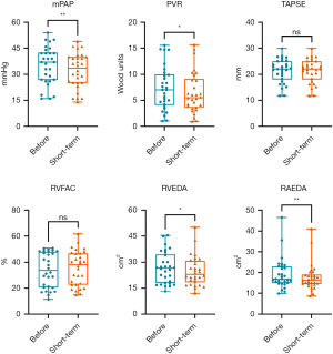 RHC was performed using a Swan-Ganz catheter (Edwards Lifesciences) before and after surgery. RHC evaluates hemodynamic parameters, including right atrial pressure (RAP), pulmonary artery pressure (PAP), pulmonary capillary wedge pressure (PCWP), PVR and cardiac output (CO). Mean right atrial pressure (mRAP), mean pulmonary artery pressure (mPAP) and mean PCWP were recorded during continuous ECG monitoring. CO was calculated using the Fick method, whereas the cardiac index (CI) was calculated by dividing the CO by the body surface area.