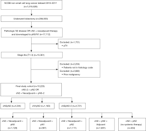 To help shed further light on these important issues, we utilized the National Cancer Database (NCDB) to better understand the association between both clinical nodal stage and timing of therapy on short and long-term outcomes in patients with pathologic N2 NSCLC who underwent anatomic surgical resection. We hypothesized that patients who were occult N2 (cN0/cN1, pN2) would have better outcomes than patients with clinically evident N2 disease. We also hypothesized that there would not be significant clinical differences between cN2 patients who underwent neoadjuvant chemotherapy, compared with those who underwent adjuvant treatment. We present the following article in accordance with the STROBE reporting checklist (available at https://jtd.amegroups.com/article/view/10.21037/jtd-21-1845/rc).