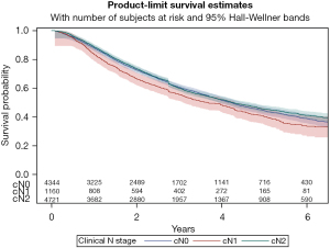 There are important limitations to this study. The survival comparison between the different clinical nodal stages is hard to interpret with this data. Unfortunately, the NCDB does not provide information on diagnostic mediastinal staging prior to surgical resection. We do not know how patients were clinically staged. This includes lack of information on endobronchial ultrasound (EBUS), mediastinoscopy, or even positron emission tomography (PET) scan. We therefore cannot make any valid conclusions about the accuracy of these diagnostic modalities or if patients were clinically staged appropriately. With that caveat, median and 5-year overall survival were similar between cN0pN2 and cN2pN2 patients, with most cN0 patients receiving adjuvant therapy while most cN2 patients received neoadjuvant. Both of these groups had a significant survival advantage of approximately 6 months and 5% at 5 years over the cN1pN2 patients, who like cN0, mostly received adjuvant therapy. When we performed a sub-analysis of only patients receiving adjuvant therapy, there was a moderate survival benefit for lower clinical stage. cN0 patients had a 5-year survival of 48.7%, compared with 44.9% and 42.7% for cN1 and cN2.