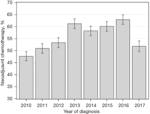 Over the 7 years of data analyzed, the rate of guideline concordance (neoadjuvant therapy for cN2 disease) slowly increased from 47.6% in 2010 to 62.9% in 2016. In 2017, there was a sudden dip in guideline concordance to 51.8%. We cannot provide a clear explanation why this occurred, as there were no major changes in guidelines that year. The only variation in the lung cancer landscape was the FDA approval of pembrolizumab (Keytruda, Merck and Co, Inc) in May of 2017 for metastatic non-squamous NSCLC (14,15). Overall, there is no obvious reason why guideline concordance is not higher, but it is reassuring to see the rates generally increasing.
