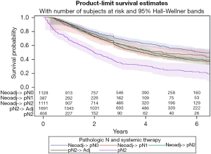 A survival analysis was performed based on receipt, timing, and nodal response to systemic therapy. Patients were divided into one of five groups: (I) complete response: cN2-> neoadjuvant-> pN0; (II) partial response: cN2-> Neoadjuvant-> pN1; (III) no response: cN2-> Neoadjuvant-> pN2; (IV) adjuvant: cN2-> pN2-> adjuvant; (V) no systemic therapy: cN2-> pN2. Complete responders showed a significantly improved survival compared to the rest of the group, while those without any systemic therapy showed a significantly worse survival (median survival: complete 6.2 years, partial 4.7 years, no response 4.2 years, adjuvant 3.9 years, no systemic therapy 2.0 years, P<0.0001) (Figure 4, Table 5).