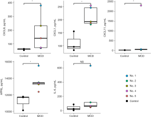 Cytokine and chemokine levels were evaluated in treatment-naïve patients compared to healthy controls. The concentrations of chemokines such as CXCL9, CXCL11, and CXCL1 (all P<0.05) were higher in the patient group than in the healthy control group. In addition, the concentration of APRIL, which is known to be associated with the proliferation of plasma cells, was significantly higher in patients with iMCD than in healthy controls (P<0.05). The IL-6 levels also tended to be higher in patients with iMCD than in the controls, but the difference was not significant (P=0.25) (Figure 4). No other cytokines or chemokines significantly differed between the two groups (Table S2).