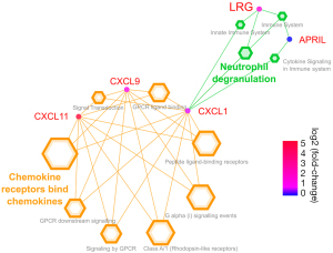 The pathway analysis indicated that LRG and chemokines were linked via neutrophil degranulation (Figure 5).