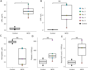 Second, because we used serum collected in the biobank, the data of hemoglobin, platelet, and neutrophil count of one of three healthy control patients were missing. These could underestimate the difference between the five iMCD patients and healthy controls. Third, we could not evaluate whether LRG levels can be used to follow patients longitudinally because none of the five patients developed progressive disease based on CDCN response criteria. Fourth, the specificity of LRG for monitoring of pulmonary manifestation of iMCD was not confirmed because iMCD with and without pulmonary involvement or other mimickers such as HHV8 positive MCD and POEMS syndromes were not compared. Fifth, this study was a single-center cohort study conducted in Japan; thus, the results may not completely represent the entire population of patients with iMCD with pulmonary involvement. A multicenter, international prospective study will be needed in future research to resolve these limitations.