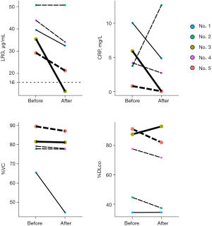 Subsequently, we focused on whether LRG and CRP behaved differently with respect to the clinical course regarding respiratory function. In patient No. 3, both the LRG and CRP levels decreased below the threshold after the induction of tocilizumab, while in patient No. 5, the LRG level did not decrease below the threshold, although the CRP level decreased below the threshold after steroid use. Further, in patient No. 3, the %VC remained steady and the %DLco increased. However, the %VC and %DLco worsened in patient No. 5 (Figure 3). This result suggested that LRG has the potential to detect smoldering inflammation or progressive disease under anti-inflammatory treatment, which could not be detected by CRP estimation due to masking.