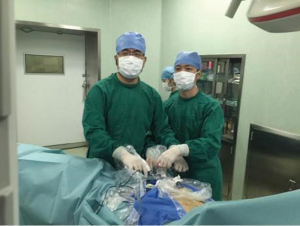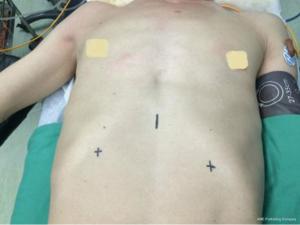 Under general anesthesia and intubation with a single-lumen endotracheal tube, the patient was placed in the type supine position with legs spread apart. The surgeon stood between the patient’s legs while the endoscopist stood on the right side of the patient to operate the camera (Figure 1). The monitor was placed on the right side of the patient. A 1.5-cm thoracoscope incision was made 0.5 cm distal to the inferior margin of the xiphoid process. A midline retrosternal tunnel was created by blunt finger dissection, and the pleura mediastinal was pushed to both sides at the costal arch. Two 0.5-cm operation incisions were created at the intersection point of bilateral midclavicular line and subcostal margin (Figure 2). The long trocars were penetrated into mediastinal cavity and did not go through the pleural cavity. Most dissection was performed by an endoscopic cautery introduced via the working channel or Harmonic scalpel. A long curved-tip ring forceps was introduced from the operation port for traction and dissection of the thymic tissues. These instruments should be guided by the surgeon’s finger to anterior mediastinum. A 10-mm 30 degree angled thoracoscope and artificial pneumothorax were used during the operation. Carbon dioxide (CO2) insufflation collapses the bilateral lungs and pericardium at the pressure of 8 mmHg, thus extending the working space behind the sternum and providing a wide operative field (Figure 3).
