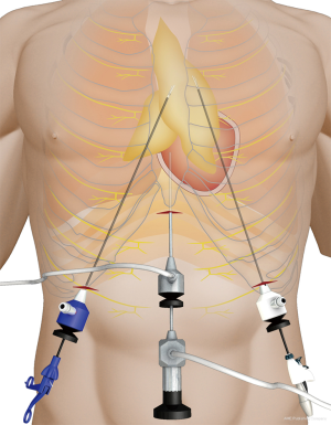 Since Blalock et al. first introduced thymectomy in 1939, median sternotomy has been the gold standard for treating myasthenia and anterior mediastinal tumor (2). With the development of endoscopic instrument technology and video-assisted surgery, the lateral intercostal approach in VATS thymectomy has been gradually applied in anterior mediastinal tumor resection. However, it is usually difficult for surgeons to make a complete mediastinal fatty tissue dissection and identify the phrenic nerve on the contralateral side. Uniportal bilateral video-assisted thoracoscopic extended thymectomy has been reported by Francesco Paolo Caronia, a procedure in which the thymus is removed through two ports (3). Although this transthoracic thoracoscopic thymectomy is minimally invasive, it still need to make two intercostal incisions and this intercostal approach from the sides of the chest is always associated with persistent postoperative pain and intercostal nerve damage. To achieve a better view of the bilateral pleural cavities and more radical thymectomy, in 2002 Hsu et al. first reported performing extended thymectomy through subxiphoid approach (4). Their approach needed to create two additional ports sitting at the bilateral intercostal space and it is possible cause intercostal nerve paralysis or neuralgia. Since Suda et al. described their first experiences of thymectomy without any intercostal incision in 2012, CO2 insufflation is applied to thymectomy through subxiphoid approach (5). The subxiphoid uniportal thoracoscopic approach has been proved feasibility for extended thymectomy (5-7). However this procedure needs to remove the xiphoid process and a 3–4 cm transverse incision, and it needs some special surgical instruments such as autonomy grasper (7). Differential lung ventilation was also needed in the subxipoid uniportal thoracoscopic thymectomy and that may damage lung function.