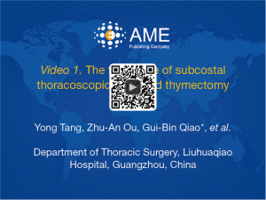 - Tang Y, Ou ZA, Qiao GB, et al. The technique of subcostal thoracoscopic extended thymectomy (STET). Asvide 2016;3:147. Available online: http://www.asvide.com/articles/888