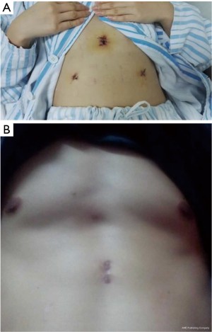 Substernal space was explored first, then right pleural cavity was entered, and the fat pad in the pericardiophrenic sinus was dissected from the pericardium. The direction of dissection was kept cephalad along the anterior border of phrenic nerve, and right lobe of thymus was separated from the underlying ascending aorta. With meticulous dissection, the conjunction of the brachiocephalic vein and superior vena cava was clearly identified. Right thymic horn was dissected and pulled downward to expose the thymic gland, which was pulled to left side using ring forceps, facilitating separation of the gland from its underlying brachiocephalic vein. Switch to left pleural cavity and rapid dissection along left phrenic nerve were performed. Left thymic horn was also dissected completely. Finally, the totally freed thymic gland and perithymic fat tissue could be brought out from the subxiphoid incision. En bloc resection of the thymus was performed by wielding a long curved-tip ring forceps in the left hand and a Harmonic scalpel in the right hand (Figures 4,5). A 20F chest tube was inserted into mediastinal cavity through the thoracoscopic port site for drainage for 13 patients, while for the 2 patients lung dilation was applied and no chest tube was placed. The thoracic tubes were usually removed on the 1st to 2nd postoperative day, and the patients were discharged the following day. Postoperative scars were small, with superior cosmesis as shown in Figure 6.