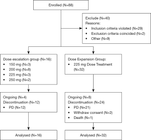 This study consisted of dose escalation and dose expansion phases. Dose escalation was based on a PK-guided 3+3 design. The starting dose was 150 mg, which was based on previous study (13). Patients orally received ensartinib administration at 150, 200, 225 and 250 mg dose levels once daily in 28-day cycles. Initially, each dose escalation cohort recruited 3–12 patients (determined by investigator and sponsor meeting based on safety or PK consideration). Dose limited toxicity (DLT) was assessed during the first 28-day cycle to determine maximum tolerated dose (MTD). After determination of the MTD and recommended dose, additional patients were enrolled in dose expansion stage and receive ensartinib at RP2D in 28-day cycles until disease progression or unacceptable toxicity. A DLT was defined as any of the following drug-related adverse events that occurred during the first treatment cycle: grade 4 neutropenia last >5 days or febrile neutropenia, grade 4 thrombocytopenia or grade 3 thrombocytopenia with bleeding, grade 3–5 nonhematologic toxicity with the exception of grade 3 rash, diarrhea, nausea, or vomiting if controlled and resolved within 48 hours, or a treatment delay of >14 days due to unresolved toxicity. The MTD was defined as the highest dose level at which less than 1/3 patients experienced a DLT. The recommended dose of ensartinib would be 250 mg daily if no more than 1 DLT occurred, otherwise the MTD would be the recommended dose.