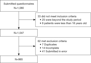 We received a total of 1,080 surveys during the investigation period. Nine hundred and eighty-five left after screening for eligibility criteria, duplicates, incompletes, and errors in submission (Figure 1).