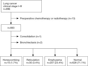 We investigated 896 patients with primary lung cancer who underwent lung resection between January 2015 and June 2020 in the Department of Thoracic Surgery, Fujita Health University Hospital, Japan. This study size was reasonable considering frequency of surgical intervention for patients who have honeycomb lung in our institution. Patients who received preoperative chemotherapy and/or radiotherapy were excluded. Patients who had radiological findings other than normal, emphysematous, reticulated, or honeycombing areas adjacent to the tumor were excluded.