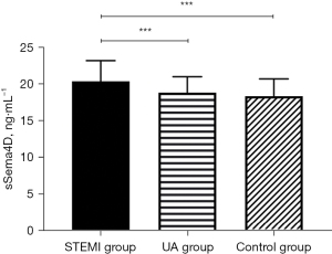There was no significant difference in the levels of clinical indicators, such as age, gender, smoking history, hypertension, diabetes, liver function (ALT), creatinine (Cr), total cholesterol (TC) and Low-Density Lipoprotein Cholesterol (LDL-C) among the groups. The levels of Inflammation index (hs-CRP) (P<0.05), and sSema4D (P<0.001) in STEMI group were higher than those in UA group and control group (Table 1). According to the results, sSema4D can better reflect the inflammatory reaction state than hs-CRP in STEMI group.