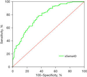 The ROC curve was drawn to evaluate the value of hs-CRP (AUC =0.697, cut-off =3.39, 95% CI: 0.629, 0.765, P<0.001) (Figure 3) and sSema4D (AUC =0.780, cut-off =19.62, 95% CI: 0.629, 0.837, P<0.001) (Figure 4) in reflecting the inflammatory state of STEMI. sSema4D is more effective than hs-CRP in reflecting the inflammatory state of STEMI [specificity (sSema4D vs. hs-CRP): 76.4% vs. 66.5%] (Table 2).