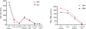After admittance, he was treated with stomachic and hepatoprotective agents along with conservative management. His symptoms subsequently lessened, and AST/ALT level stabilized. On hospital day 4, AST/ALT declined to 59/112 IU/L; γ-GT, 90 IU/L; TBIL, 194.1 µmol/L;DBIL, 161.8 µmol/L; urinary leukocyte 108.7/µL. Seven days after hospitalization, there was no tenderness or discomfort in his right upper quadrant of the abdomen, no jaundice with nausea, vomiting, loss of appetite either. No notable findings were present upon examination of the other systems. The predominant laboratory findings were as below: AST, 30 IU/L; ALT, 36 IU/L; γ-GT, 86 IU/L.