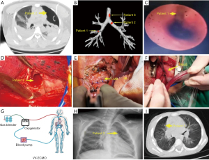 There are 2 common ECMO configurations. A is VA where the femoral artery and the vein are cannulated. The other is the VV approach, where the femoral vein and the internal jugular vein are cannulated (5). In this report, our team successfully applied VV-ECMO to provide adjunctive support to 3 critically ill patients with bronchial rupture and concomitant circulatory and respiratory failure while safely completing the emergency surgical procedure. In summary, we presented the feasibility of the ECMO application in the case of traumatic tracheal or bronchial rupture. VV-ECMO for adjunctive support in critically ill traumatic bronchial rupture patients can allow more time to resuscitate and stabilize the patient and can reduce the risk of anesthesia and emergency surgery (17). However, further studies with larger cohorts and long-term follow-up are needed to further assess its value in this field.