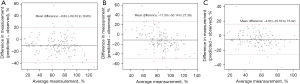 Scatter plots for effort-dependent measures suggested the tendency for underprediction (observed values were higher than predicted) for FEV1 and FVC but good agreement for DLCO (Figure 1). Formal agreement confirmed mean difference for FEV1 was −9.84% [95% confidence interval (CI): −39.33% to 19.65%], FVC −11.39% (95% CI: −50.14% to 27.36%) and DLCO −4.83% (95% CI: −25.59% to 15.92%) as demonstrated in Figure 2.