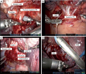 Compared with the look-up technique from the lower intercostal spaces, the OTVA provides a superior cranial view owing to the high position of the camera port. For example, in right upper lobectomy, the cranial view of the upper pulmonary vein and the truncus superior pulmonary artery is good, enabling safe surgery (Figure 3A). The anterior view of the pulmonary hilum during left upper lobectomy also provides satisfactory visualization (Figure 3B). The posterior view is also satisfactory when using a 30° robotic camera and switching between the up and down views (Figure 3C). When stapling between the right upper and middle lobes, a smooth dissection is achievable using a robotic stapler through the port in the lower intercostal space (Figure 3D). The Video shows an external perspective of the surgical scene as well as an intrathoracic view of right upper lobectomy performed using RATS by the modified OTVA method (Video 1).