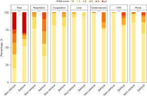 The median SOFA score of all enrolled patients was 1 (IQR, 0–18). The mean SOFA score was significantly lower in the non-serious group than in the serious group {0 [0–1] vs. 5 [2–9], respectively; P<0.001} (Table 2). According to the SOFA score, 147 (64.19%) patients fulfilled the Sepsis 3.0 criteria and were diagnosed with Omicron-associated sepsis at hospital admission. Among them, most patients (n=113, 76.87%) were in the serious group. Of the patients with sepsis, the individual organ SOFA scores for the respiratory, coagulation, cardiovascular, central nervous, and renal systems were significantly higher in the serious group than in the non-serious group (all P<0.05) (Table 2, Figure 1). Finally, among the patients with sepsis, 49 underwent lactate measurement within 24 hours of admission. Of these, 20 out of 49 (40.81%) exhibited septic shock, and most of them were in the serious group (17/20, 85%).
