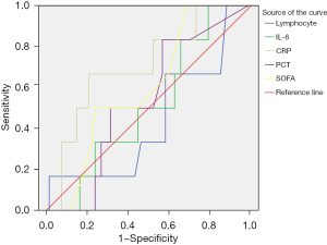 An ROC curve with the SOFA score and other inflammatory biomarkers was drawn to predict transfer to the ICU (Figure 2). We found that the CRP concentration had the highest predictive value [area under the ROC curve (AUC) =0.706, 95% confidence interval (CI): 0.496–0.917, P=0.096], followed by the SOFA score (AUC =0.602, 95% CI: 0.412–0.792, P=0.410), PCT concentration (AUC =0.537, 95% CI: 0.342–0.732, P=0.763), and IL-6 concentration (AUC =0.512, 95% CI: 0.311–0.714, P=0.92). The AUC of the lymphocyte count was only 0.440. Next, we evaluated the correlation between the SOFA score and these markers, and the results showed that the SOFA score was well correlated with the CRP concentration (r=0.503, P<0.01), followed by the IL-6 concentration (r=0.503, P<0.01) and PCT concentration (r=0.267, P<0.01). By contrast, the SOFA score had no correlation with the lymphocyte count (r=−0.108, P=0.09).