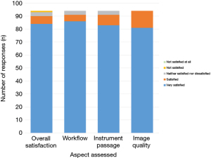 Data collected included patient demographics and COVID-19 status, procedure details (location, indication, SUFB size, procedure performed, complications), and user satisfaction and demographics (see appendix available at https://cdn.amegroups.cn/static/public/JTD-24-1538-1.docx for sample questionnaire). User satisfaction was visualized using a Likert scale of one to five in ascending order of satisfaction. Satisfaction ratings were also recorded with regards to workflow, ease of instrument passage, and image quality. Incidence of technical limitations relating to scope handle, suction connector, suction quality, image failure, or inability to sample lobes were also recorded. Incidence of patient-related complications was also recorded.