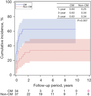 The analysis for occurrence of atrial fibrillation was performed without IPTW adjustment due to missing electrocardiogram data during the outpatient clinic follow-up. The cumulative incidence of atrial fibrillation occurrence was significantly lower in the CM group (1-, 3-, and 5-year incidence of 19%/34%/37% in the CM group vs. 63%/73%/78% in the non-CM group, respectively; P<0.001) (Figure 2). The cumulative incidence of anticoagulation discontinuation was significantly higher in the CM group both before and after IPTW adjustment (1-, 3-, and 5-year incidences 43%/45%/45% in the CM group vs. 17%/23%/23% in the non-CM group, P=0.01, before IPTW; 48%/49%/49% vs. 15%/19%/19%, P=0.001, after IPTW) (Figure 3). In the subgroup analysis of patients with tissue valves, the cumulative incidence of anticoagulation discontinuation was significantly higher in the CM group (1-, 3-, and 5-year incidences 60%/63%/63% in the CM group vs. 25%/34%/34% in the non-CM group, P=0.007) (Figure 4). Multivariable risk factor analysis identified the concomitant Cox-Maze procedure as a significant prognostic factor [subdistribution hazard ratio (sHR) 0.33, 95% confidence interval (CI): 0.20–0.53, P<0.001] for occurrence of atrial fibrillation (Table S1).